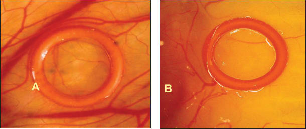 Figure 1. In an in vivo chick chorioallantoic membrane assay, OC-10X inhibited angiogenesis: A. Normal chick assay; B. OC-10X assay.