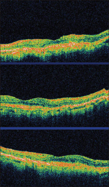 Figure 3. From baseline (top), the patient improved to 282 µm retinal thickness (center). Four weeks after that (bottom), the macula was dry.