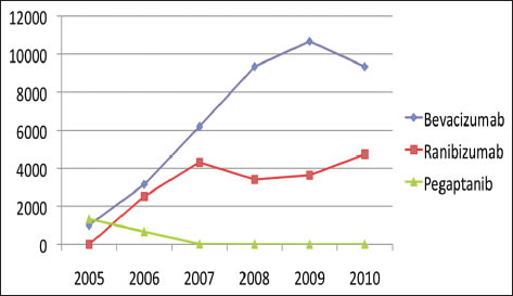 Figure 11. Over five years, bevacizumab injection rates have soared at BPEI, while ranibizumab has leveled off and pegaptanib has sunk to zero.