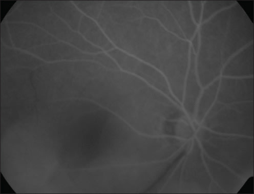 Figure 1. Fluorescein angiography of the right eye showed a severe delay in dye transit time and an absence of dye in two branches of the inferior retinal arterial system.