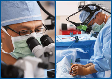 Vitrectomy can be therapeutic for patients with significant epiretinal proliferation and traction. Dr. Dugel performs the procedure (left). At right, Dr. Dugel is shown using a laser on a retinal tear in surgery.