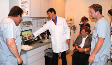Michael Colucciello, MD, consults with a patient while retina staff look on. Staff members shown left to right are William Whitcraft, COA; Jennifer Morris, COA; and Michael Gulli. |