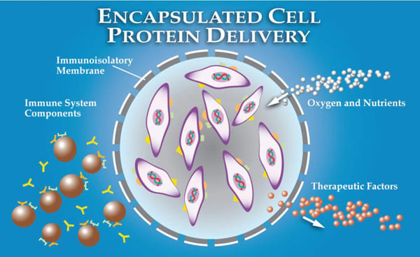 Figure 1b. The diffusive characteristics of the ECT membrane allow long-term cell survival by allowing influx of oxygen and nutrients, while simultaneously preventing direct contact of the encapsulated cells with the cellular and molecular elements of the immune system.