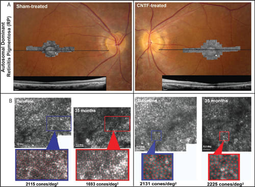 Three patients from the CNTF4 trial were evaluated using adaptive optics scanning laser ophthalmoscopy (AOSLO), which allowed direct visualization of cones noninvasively (Figure 2).36 All three patients showed no significant differences in visual acuity, visual field sensitivity, or ERG amplitudes, between the sham and CNTF-treated eyes, over 30 months. However, cone spacing increased by 2.9%, and cone density decreased by 9% to 24% more in ham-treated eyes compared with CNTF-treated eyes.