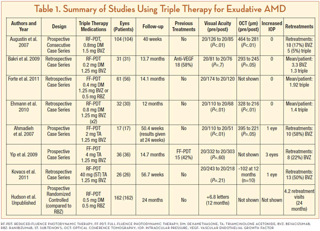 By the same rationale, “triple-therapy” with all three medications may reduce the number of injections needed for visual and anatomic improvement. In theory, the PDT arm of the triad causes vaso-occlusion within the CNV membrane, while secondary upregulation of proinflammatory cytokines and VEGF released after PDT is inhibited by corticosteroids and anti-VEGF medications. The results of eight studies using triple therapy for exudative AMD are reviewed below.5-12