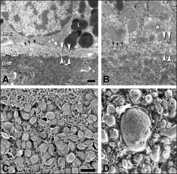 “So, what does all of this mean?” Dr. Curcio said by way of presenting the overall model of her presentation, ie, that lipoprotein particles form an “oil spill” in Bruch's membrane (Figure 16), which Dr. Curcio said was “just like an oil spill on the surface of sea water.” She demonstrated that these particles that appear to be vesicles on conventional post-fixation are actually solid particles when examined by quick-freeze deep etching. As age increases and lesions form, there is a fusion and pooling of lipids.