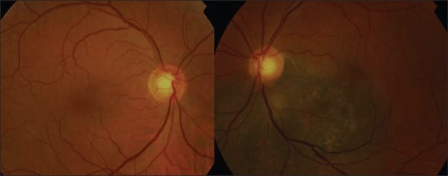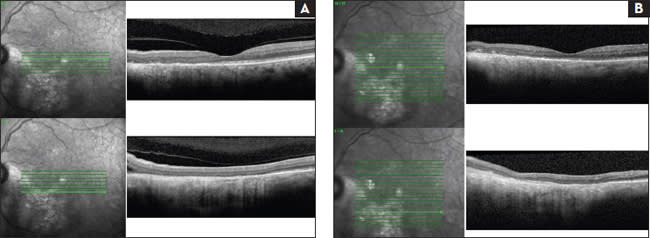 Figure 3. The same patients from Figure 2. SD-OCT shows subretinal fluid inferotemporal to optic nerve (A) and resolution of the fluid (B).