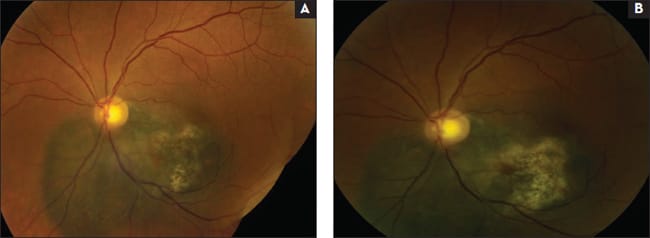 Figure 2. Two images of choroidal melanoma: post-plaque treatment (A) and post-plaque treatment with retinal detachment over tumor extending into the macula (B).