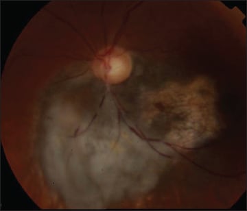 Figure 1. Endoresection was first investigated for posterior uveal melanoma in the late 1980s, primarily for small juxtapapillary tumors like the above.