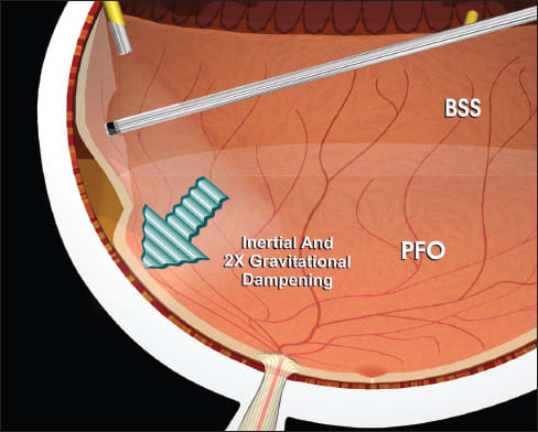 Inertial stabilization is based on the equation F = ma (force = mass x acceleration); thus, higher mass reduces acceleration. PFO and the retina at the interface move less in response to pulsatile vitreoretinal traction from the cutter opening and closing than they would with an infusion fluid–filled eye.