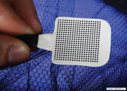 The BrainPort vision system consists of a postage-stamp–sized array of 400 electrodes placed on the top surface of the tongue (Figure 2), a digital video camera affixed to a pair of sunglasses and a hand-held controller for settings, such as zoom and control of the stimulation level. Visual information is collected from the user-adjustable head-mounted camera (field of view 3º to 73º) and is sent to the BrainPort handheld controller.