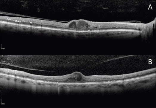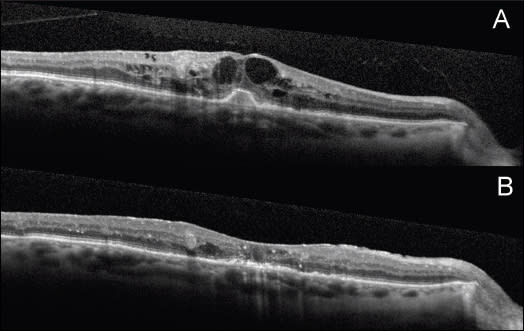 Figure 3. A. A baseline OCT linear scan shows a thickened posterior hyaloid, cystic macular edema, and bumped RPE in the fovea. B. A follow-up OCT linear scan three months after vitrectomy shows improvement of DME; however, the ELM is focally disrupted in the fovea, and the IS/OS junction is thickened.