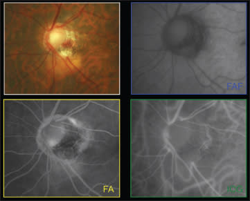 The next case was of a 72-year-old woman with a red-orange lesion on the inferior pole of the optic nerve (Figure 7). Multimodal imaging was inconclusive (Figure 8). EDI-OCT revealed that the lesion was caused by an entity first described by Dr. Freund now known as peripapillary choroidal thickening and cavitation.