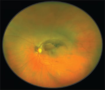Figure 5. On fundus photography, this case resembled schisis or a retinal detachment. SD-OCT revealed schisis.