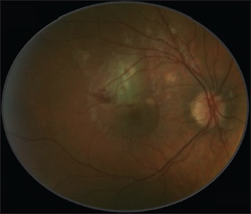 Figure 9. This 16-year-old girl had a scotoma and CNV, as well as yellowish lesions along the superotemporal arcade.