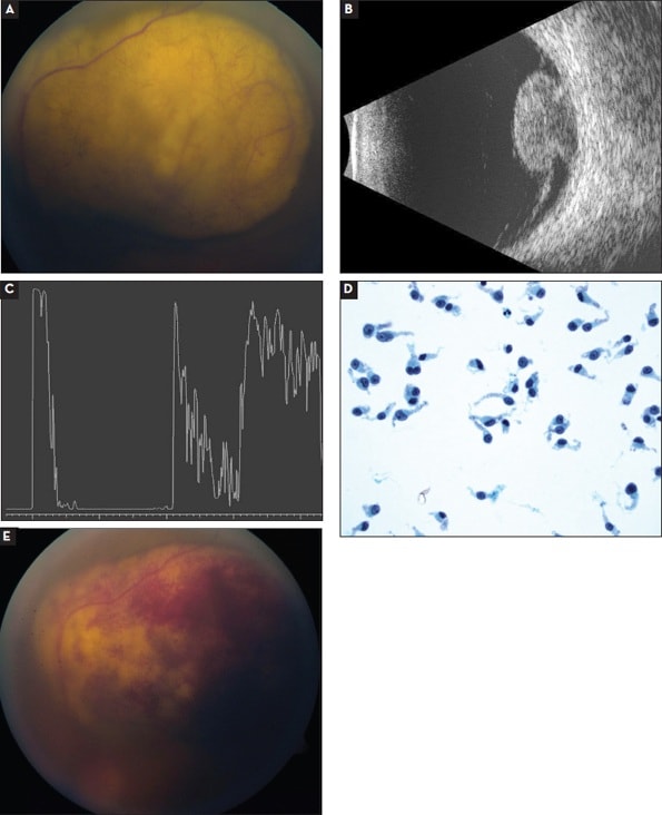 Figure 1. Fundus photograph depicting a completely amelanotic tumor (A). B-scan ultrasonography demonstrated a collar-button-shaped tumor (B). A-scan ultrasonography showed low to medium internal reflectivity (C). Fine-needle aspiration biopsy revealed spindle cells lacking melanin, consistent with the clinical impression of amelanotic choroidal melanoma (D). A localized preretinal hemorrhage is seen overlying the needle biopsy site, which generally clears in several weeks (E).
