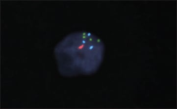 Figure 2. Fluorescence in situ hybridization of choroidal melanoma demonstrates monosomy 3 (one orange alphacentromeric signal) and aneusomy of chromosome 8 (CEP8 Aqua) with an approximately equal number of 8q24 MYC signals (green; no net gain compared to the reference CEP8 probe; for MYC amplification to be present, the MYC-to-CEP8 ratio must be >2.0). Figure courtesy of Raymond R. Tubbs, DO, Department of Molecular Pathology, Pathology and Laboratory Medicine Institute, Cleveland Clinic.