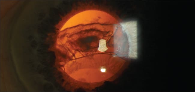 A 91-year-old woman was referred for a dislocated IOL in her left eye. The patient had undergone uncomplicated cataract extraction four years earlier, followed by a YAG laser capsulotomy three months later. There was no evidence of glaucoma on exam. She had recently noted worsening of her vision for the previous two months. A YAG laser capsulotomy was performed because of opacity in the visual axis. The patient reported moderately improved vision that lasted for a few days and then worsened. At her follow-up appointment, she was referred for management of a dislocated IOL (Figure 1).