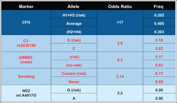 Figure 1. SNPs and haplotypes associated with AMD progression. Combining analysis of haplotypes and SNPs from four AMD-associated genes, combined with smoking history, provides an excellent predictability (OR = 0.83) reflex for the progression of AMD. The gene products utilized are involved in the complement pathway, CFH, C3, oxidative metabolism, ARMS2, and ND2. The two most significant genetic associations are in the CFH and ARMS2 genes.