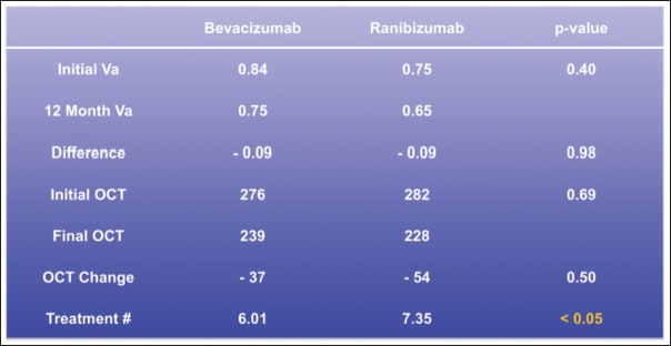 To confirm that the analysis was performed on wet AMD patients who responded typically to treatment, visual acuity, central OCT thickness, and treatment burden data were tabulated, and indeed, the results were strikingly similar to the one-year data from the PRN arm of the CATT and IVAN trials. In this cohort of patients, the monotherapy data with either ranibizumab or bevacizumab represent roughly 50% of the patients that enrolled in the variable arm of the CATT trial, and they were retrospective, rather than prospective, data.