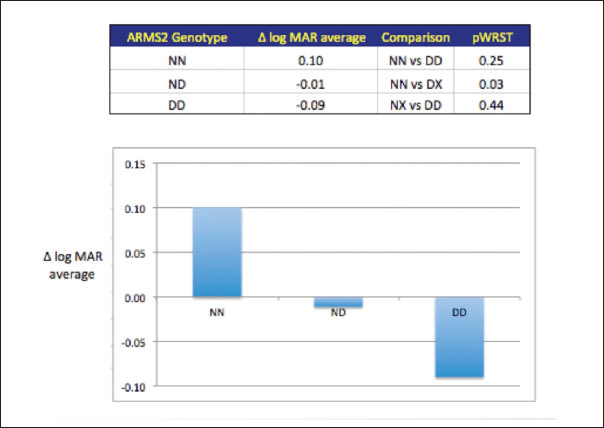 However, there was no correlation of overall risk score with response to anti-VEGF treatment in terms of visual acuity change, OCT thickness change, or treatment number. There were no independent associations of SNPs within the CFH, C3, or ND2 genes with response to anti-VEGF therapy based on these three parameters. However, at least one insertion/deletion polymorphic site, indel (NM_001099667.1:C.* 372_815del443ins54), within the ARMS2 gene identified by Hybe Probe Assay (Roche Applied Science), was found in 63 patients who had an average improvement in logMAR visual acuity of 0. 11, compared to a visual deterioration of 0.10 logMAR in those with the ancestral genotype (P = .0155, Wilcoxon rank sum test), which indicates both a clinically and statistically significant association (Figure 3).
