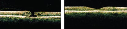 At left, macular hole prior to ocriplasmin injection, with VA of 20/63. Ar right, six months following treatment VA has improved to 20/25.