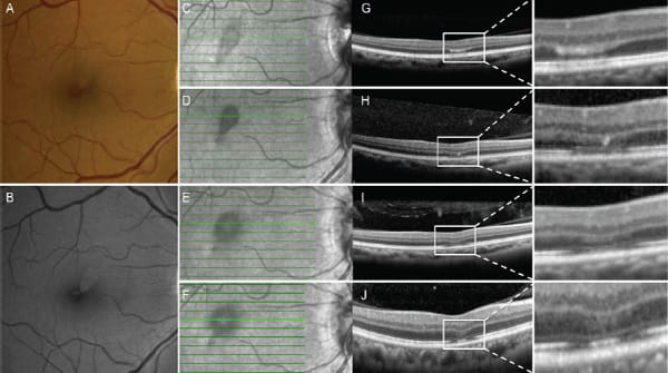 While the clinical examination findings in AMN are often quite subtle, near-infrared (NIR) reflectance imaging usually shows characteristic dark gray, paracentral lesions, which typically point toward the foveal center (Figure 2C).11,18-20 As this condition progresses, these gray hyporeflective lesions can increase in intensity (Figure 2D) and can extend laterally (Figure 2E), before eventually fading (Figure 2F).