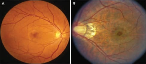 Figure 1. Color fundus images of a right (A) and left (B) eye from two patients displaying multiple dark, relatively well-defined, wedge-shaped intraretinal lesions pointing to the fovea in a flower petal arrangement. Note the reddish color of the lesion varies depending on the level of background fundus pigmentation.