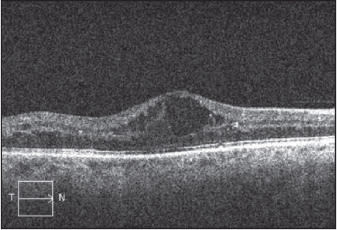 Figure 2. Preoperative SD-OCT (left ) shows significant macular edema with cystoid fluid accumulation in a patient with background DR. A one-month posoperative SD-OCT image (right) shows significant improvement in macular thickness and resolution of the cystoid spaces.