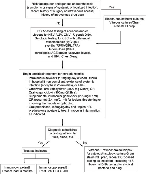 Figure 6. Decision tree summarizing the recommended approach for the patient with retinitis of unclear etiology.