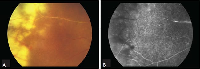 Figure 3. (A) Peripheral necrotizing retinitis and periarteritis. (B) Midphase fluorescein angiogram showing extensive peripheral nonperfusion with segmental arteriolar occlusion. Nodular arteritis with Kyrieleis plaques is also evident.