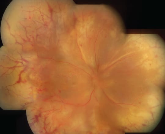 Figure 2. Extensive peripheral necrotizing retinitis and periarteritis in an immunocompetent patient with ARN.