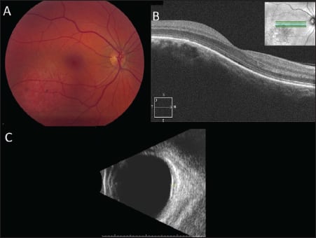 Figure 4. Two months after external beam radiotherapy that involved a total dose of 2000 cGy in 10 sessions, fundus photographs (A) and OCT (B) demonstrated resolution of the retinal detachment. Ultrasonography (C) revealed a thinning of the previously noted thickened choroid.