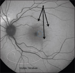 The Landmark Patterns feature (arrows) provides reference markers (set by visible titration — spots in the periphery) on the outer edges of the patterns used for treatment. With Endpoint Management, laser energy is delivered at a reduced percentage of the set Landmark power.