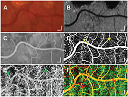 Figure 3. Identification of an abnormality in CC at the edges of GA for a scanning area of 3 × 1.5 mm2. Selected regions of a color fundus photograph (A), AF (B), and an early phase of FA (C). An en face image (D) from pvOCT data shows fine normal retinal capillaries (yellow arrows) at the edge of GA, which are not as well visualized with FA (C). A CC perfusion map (E) from pvOCT illustrates small focal areas of CC dropout near the inferior edge of GA, which correlates with the areas of irregular choroidal filling on FA (C). A color composite image (F) of retinal circulation (D, red) and CC (E, green) from pvOCT. (Scale bars, 200 μm.)