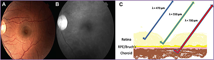 Figure 1. Color fundus photograph (A) of a left eye. Near infrared image (B) with diminished epiretinal details and enhanced subretinal features. Retinal cross-section (C) depicting the capacity of each wavelength to penetrate the retinal layers.