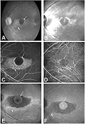 Figure 4. Chloroquine maculopathy. The arrow points to a circular area of condensed pigment; the arrowhead an area of pigment atrophy. A) Fundus photograph. B) NIR reflectance increases in the area of depigmentation (arrowhead). C) Fluorescein angiogram. D) ICG angiogram. E) Blue-light–excited autofluorescence showing almost regular blue-light–excited autofluorescence in the circular area of condensed pigment, whereas the rim of the atrophy shows increased blue-light–excited autofluorescence (arrowhead). F) The NIR fluorescence signal is strongest in the central circular area. The increased NIR reflectance does not contribute to NIR fluorescence (arrowhead).