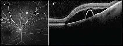 Figure 2. Fluorescein angiography (A) shows a pinpoint area of hyperfluorescence consistent with the diagnosis of CSR. A peripheral targeted SD-OCT B-scan (B) shows both subretinal fluid and a pigment epithelial detachment in a patient with peripheral CSR.
