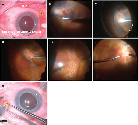 Figure 2. While performing pars plana vitrectomy (A), scleral depression (B) helped to ensure the vitreous base was thoroughly dissected. After relief of vitreous traction from the break and amputation of the anterior edge of the GRT (C), endodiathermy was used to cauterize bleeding vessels at the edge of the GRT (D). During fluid-air exchange, the cannula was used to pull the retina peripherally (E). A laser probe was used to complete retinopexy (F) and C3F8 gas was perfused (G).