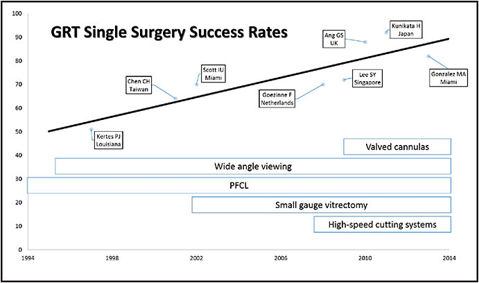 Figure 1. Primary anatomic success rates in the surgical repair of GRT-related RRD have improved over time with new techniques and technologies.