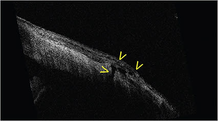 Anterior segment iOCT may also be useful for the retinal surgeon. Here, iOCT of the pars plana immediately after trocar cannulas are removed clearly illustrates the rationale for beveled vitrectomy trocar cannula placement. In this image of the pars plana after the cannulas are removed, an open 25-gauge sclerotomy is present with a small conjunctival bleb (Figure 7). This is in sharp contradistinction to this much more beveled sclerotomy which is closed and does not have an overlying conjunctival bleb (Figure 8, page 52).