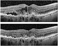 Figure 1. A 75-year-old Caucasian female with 2-week history of visual loss in her right eye. Examination identified neovascular AMD OD. SD-OCT at baseline (top) revealed intra-retinal and subretinal fluid with drusen. SD-OCT at follow-up (bottom), after initiation of ranibizumab, revealed improved macular edema with focal pocket of residual subretinal fluid.