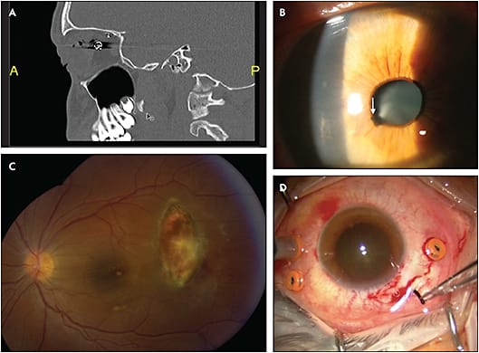 Figure 2. Orbital, anterior-segment, and posterior-segment IOFB presentation and management. A) CT scan of the orbits, sagittal view, of a 13-year-old boy who suffered an injury due to a pellet gun. A perforating eye injury to the right eye with both entrance and exit wounds is visible on the scan, as well as the retained lead pellet in the orbit. B) Anterior-chamber IOFB (arrow) with involvement of anterior lens capsule. C) Encapsulated ferromagnetic IOFB of one month duration in a 16-year-old child from Honduras. D) Pars plana removal of a piece of wire wheel brush. A separate sclerotomy was created in this 23-gauge case, and the crystalline lens was spared.