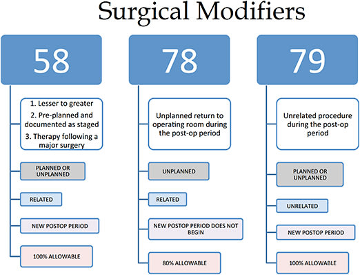 Modifiers are confusing — particularly identifying the appropriate modifier to use when additional surgery is performed within the global period. To determine the correct modifier, most commonly 58, -78 or -79, there are different factors to consider, such as: