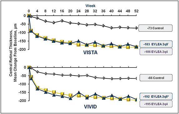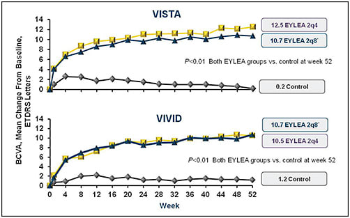 Based on the positive data in DA VINCI, two large phase 3 clinical trials, using intravitreal injections of aflibercept for DME, were organized. The VISTA and VIVID trials were parallel, double-masked trials comparing the safety and efficacy of focal laser photocoagulation (with sham intraocular injections) to intravitreal aflibercept dosed either every four weeks or every eight weeks, after five initial monthly doses.11 These trials enrolled 872 eyes with vision loss due to center-involved DME, and approximately 90% of the subjects completed the week 52 primary endpoint visit.