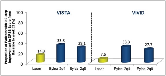An interesting finding of the VISTA and VIVID trials was that there was a significant improvement in the level of DR at week 52 in the aflibercept treatment groups, compared to the laser group (Figure 4).