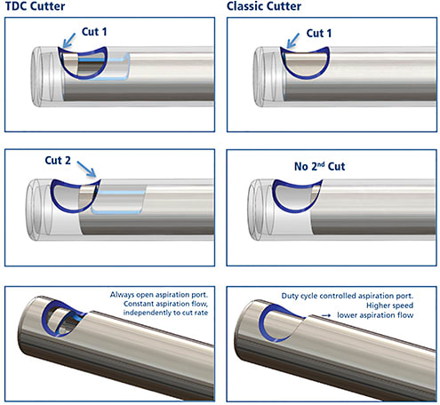 Design of DORC International’s TDC vitrectome vs. conventional vitreous cutter: with the TDC vitrectome, vitreous is brought into the inner aperture and cut in a forward and then backward motion, increasing the amount of vitreous cut in a single motion.