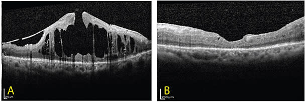 Figure 3. A) OCT of left eye showing severe IRF with an ERM. (B) Resolution of IRF after vitrectomy with membrane peel.