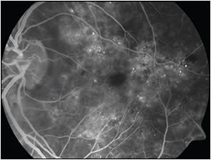 Figure 2. Pre-Navilas treatment fluorescein angiography of a case, showing mild ischemic changes within the fovea of a patient with clinically significant macular edema