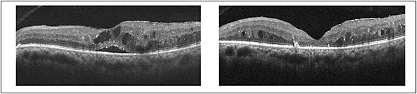 At our clinic, the patient received OCT-based navigated laser treatment in the left eye (Figure 3). Six months after the treatment, the presence of macular edema was reduced significantly, and the patient’s VA demonstrated stability at 20/40 (Figures 4 and 5, page 44).
